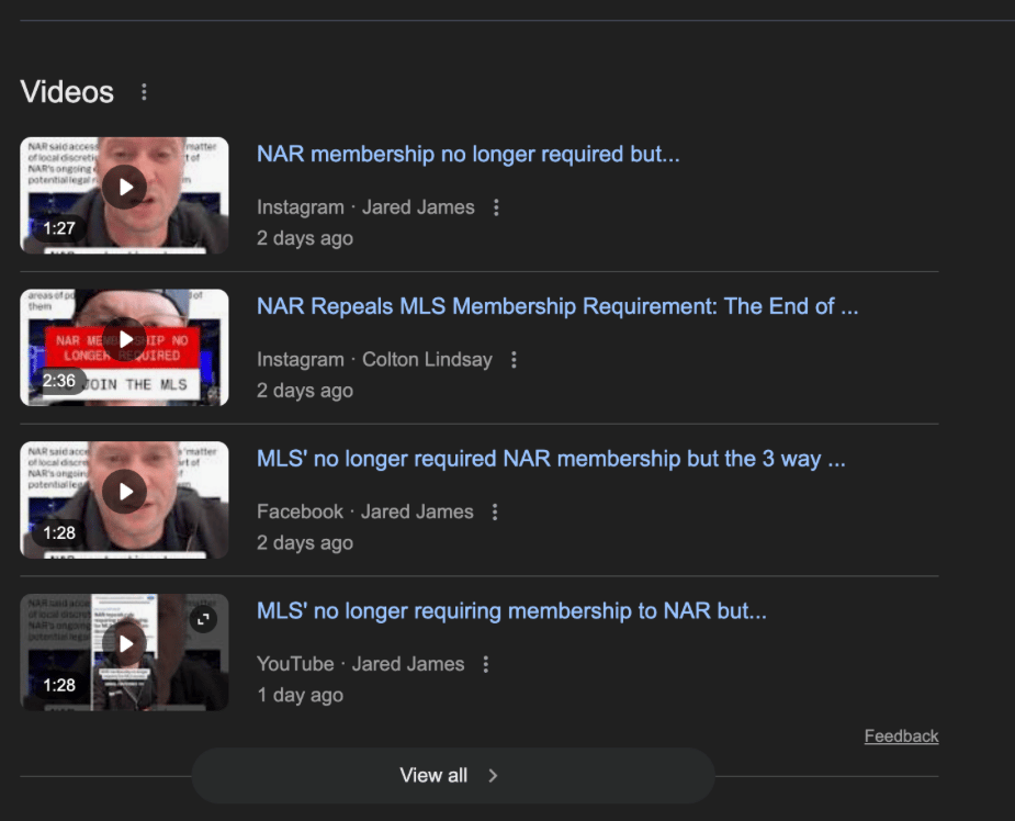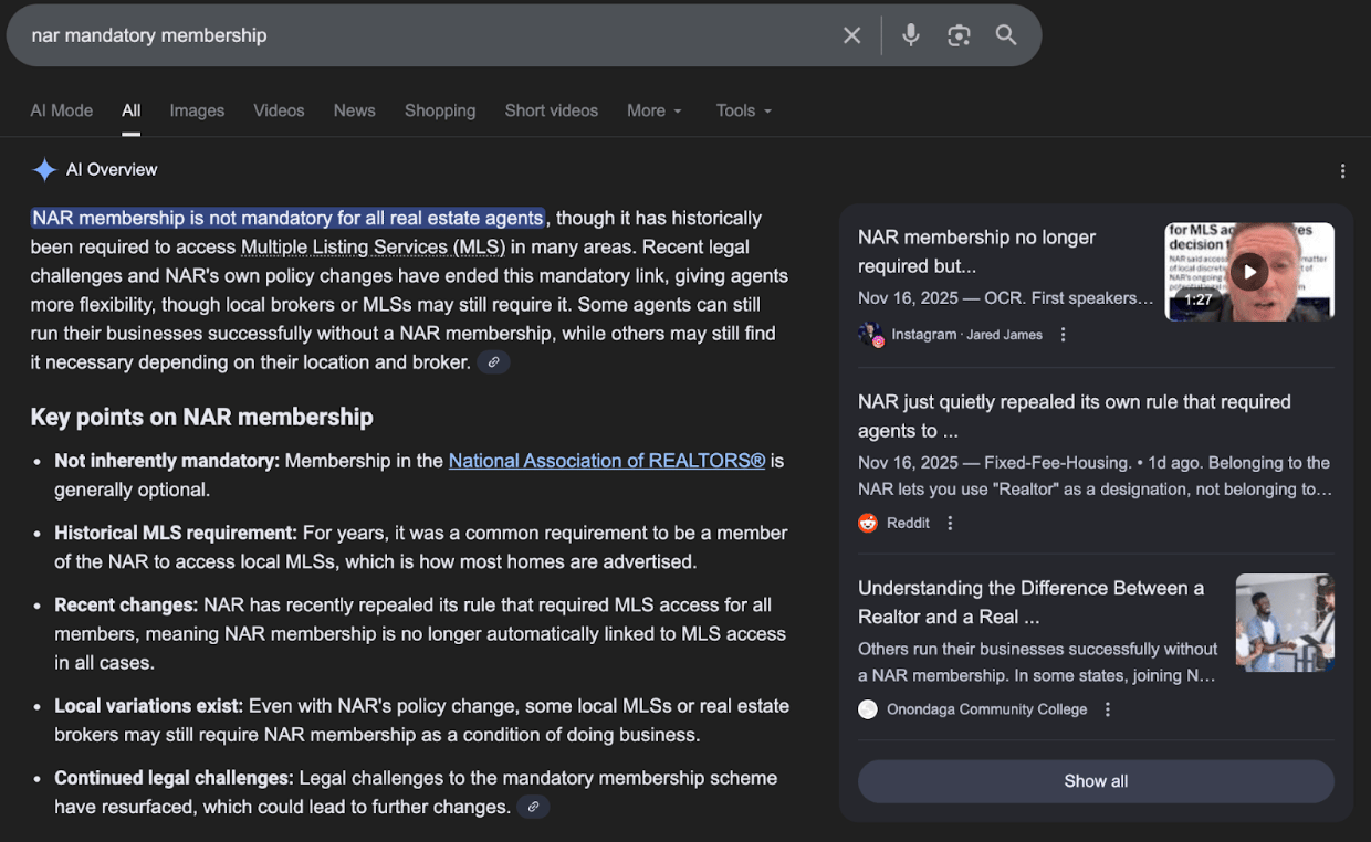 I found it super interesting that when I googled “nar mandatory membership”, Jared’s video on IG is the first result on the top right and even above YouTube (after Google’s AI Overview, of course).